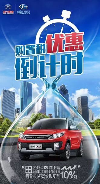 2017年12月31日前,購(gòu)買1.6L及以下北汽昌河車型,按7.5%的稅率征收車輛購(gòu)置稅。2018年1月1日起,將恢復(fù)按10%的法定稅率征收車輛購(gòu)置稅。從即日起至2017年12月31日,扣除休息日,僅剩23天。